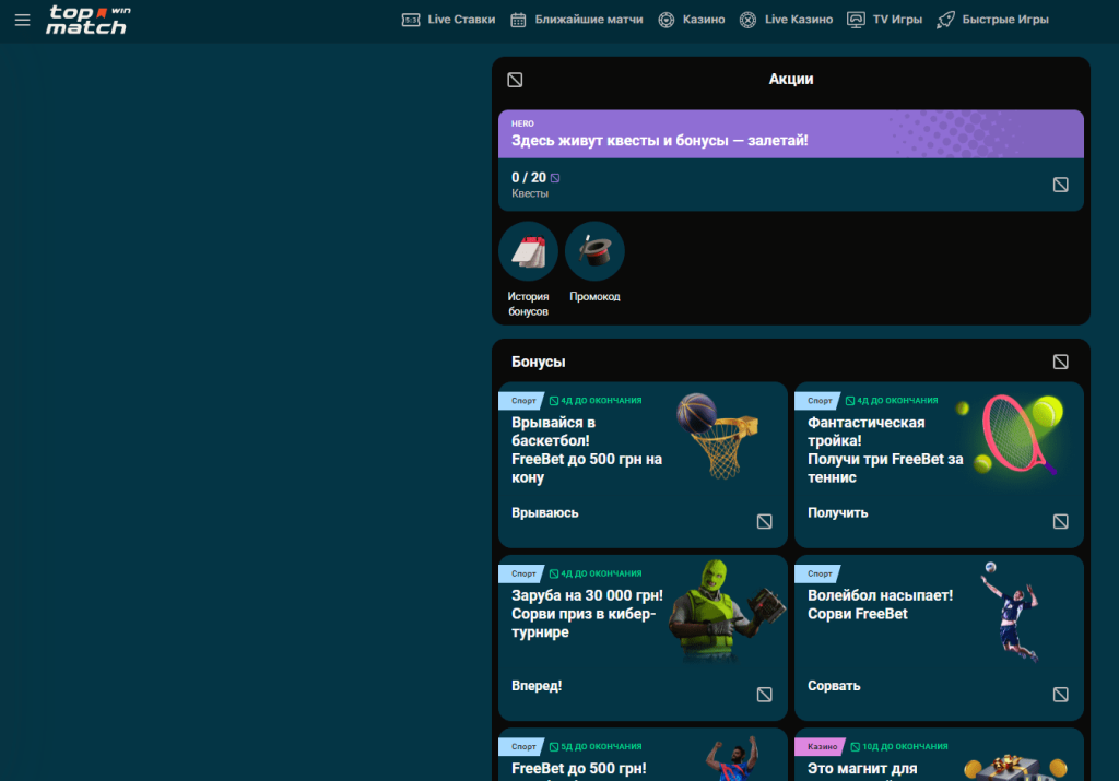 Офіційний сайт БК ТопМатч постійно розширює каталог видів спорту й турнірів. Для кожної гри наявні кілька десятків ринків – від класичних (переможець матчу) до специфічних (кількість кутків, перший голодарний, жовтих карток). Live-трансляції деяких матчів вбудовані в платформу.